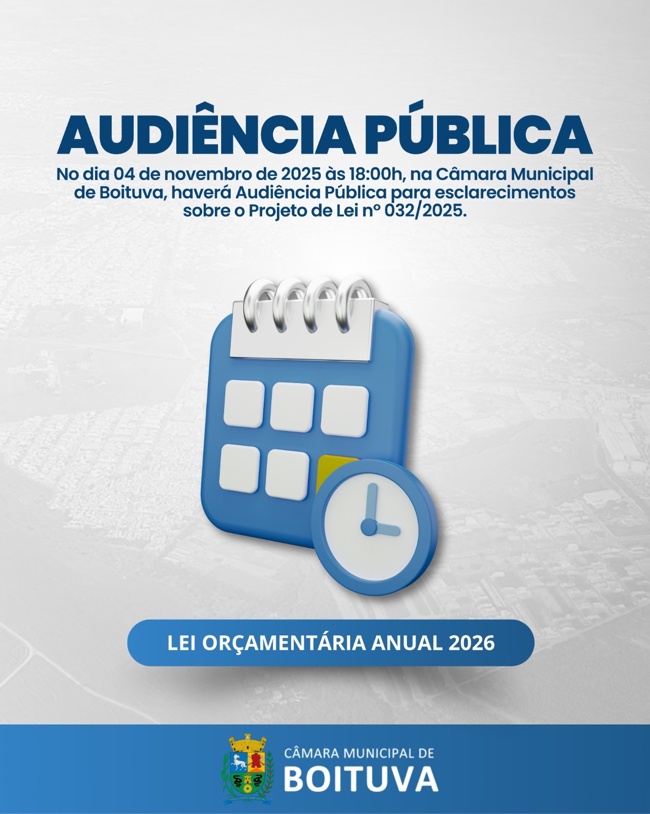 AUDIÊNCIA PÚBLICA-PPA A Prefeitura de Boituva, por meio da Secretaria de Governo e Planejamento Estratégico, realizará nesta quinta-feira, 28 de agosto de 2025, às 18h, no plenário da Câmara Municipal, a Audiência Pública de apresentação do Projeto de Lei do PPA (Plano Plurianual) para o período de 2026 a 2029. PARTICIPAÇÃO POPULAR O evento é aberto à população e contará com a presença da Comissão de...