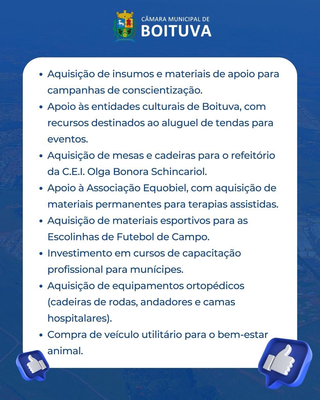 As emendas impositivas são indicações dos vereadores que destinam parte do orçamento municipal para ações e melhorias específicas. Por lei, essas emendas devem ser executadas pela Prefeitura no exercício seguinte.
