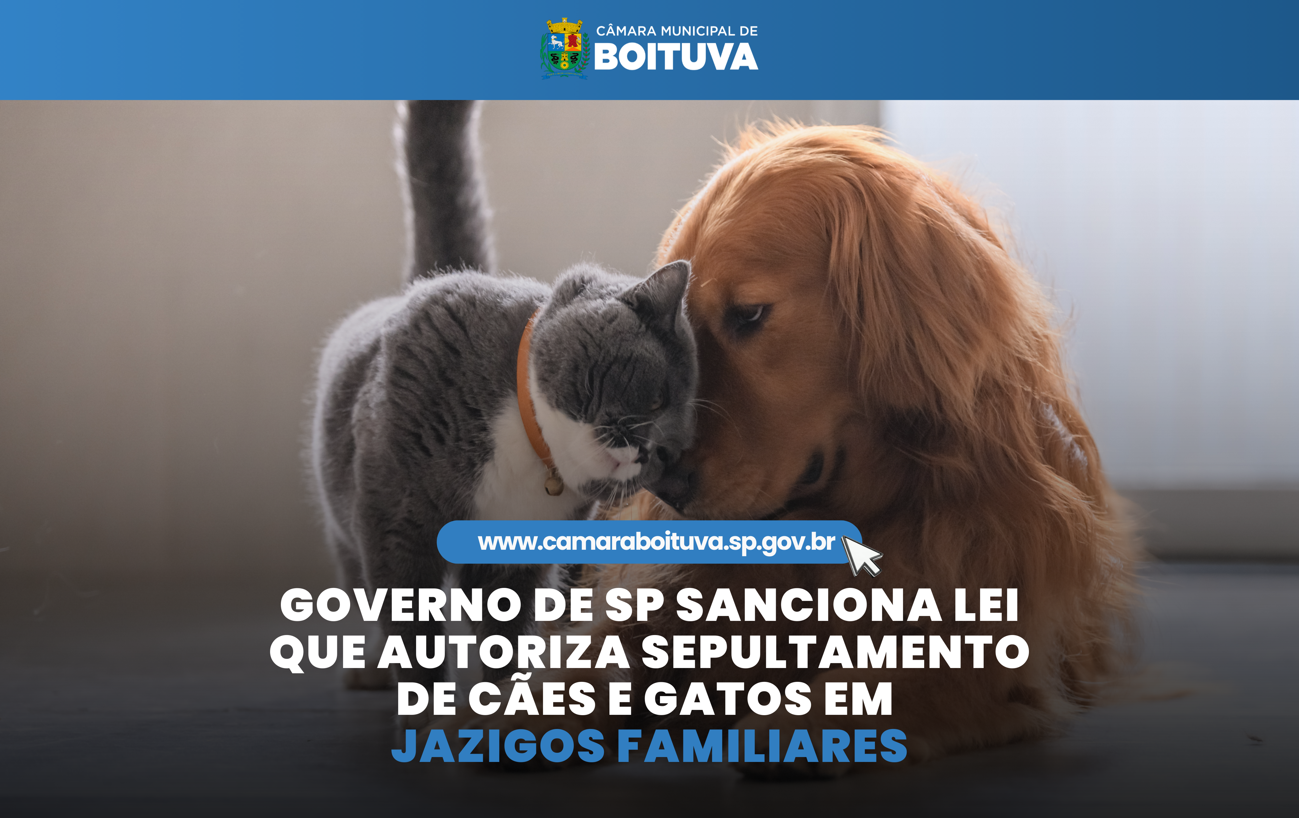 A Câmara Municipal de Boituva informa que o Governo do Estado de São Paulo sancionou, nesta terça-feira (10), a lei que autoriza o sepultamento de cães e gatos em jazigos familiares em todo o território paulista. A norma reconhece oficialmente o vínculo afetivo entre tutores e seus animais de estimação.