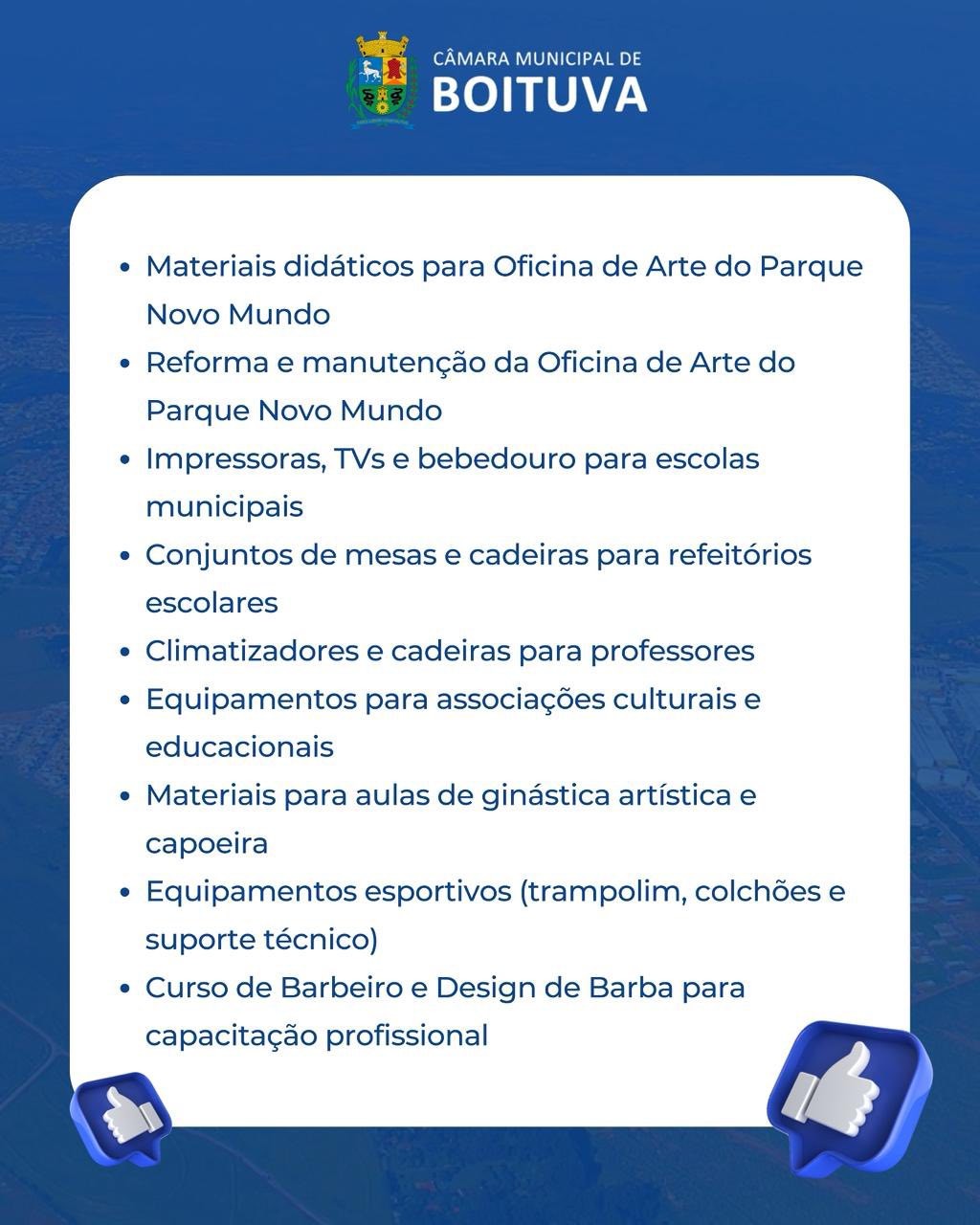 As emendas impositivas são indicações dos vereadores que destinam parte do orçamento municipal para ações e melhorias específicas. Por lei, essas emendas devem ser executadas pela Prefeitura no exercício seguinte.